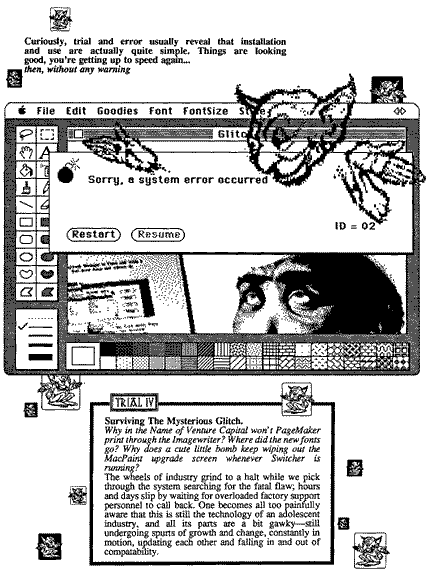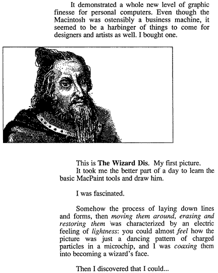 I quickly became a willing participant in the evolutionary process despite the occasional arrow that pioneers suffer. There were few resources for learning, forcing the early adopters to go it alone. The only paint program available for the computer shipped bundled with my Mac 512K‹it was aptly called MacPaint. The first sentence of the 32-page pictorial manual stated, "The best way to learn MacPaint is to explore the drawing tools and patterns on your own. This is a book of hints to guide you in your exploration."