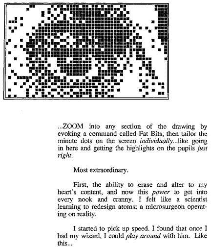 Goodies consisted primarily of a 'mode' called FatBits, which enlarged the image size to about 1600% making it easier to edit the image‹pixel by literal pixel. MacPaint file resolution was limited to 72 dpi. The only way to get better resolution was to use a word processing program, or a drawing program. In 1985, that would have been MacDraw, which was a watered down version of the draw module in today's AppleWorks. I guess I learned everything there was to know about MacPaint in a few weeks or so while I was learning how to use the computer and manage my files. Zen didn't come until maybe one year later, but that was all right, because I don't think I came out of hibernation until then anyway. During that time I learned everything there was to know about Microsoft Word, MacDraw and PageMaker, which made its debut in 1986. Apple bundled a word processing program called MacWrite with the 512K, but MacWrite lacked the ability to create 'leader dots'þfill characters with a right tab, and that was an absolute must for any typesetter. That made me a very early adopter of Microsoft products. None of the word processing programs let you put graphics and type on the same horizontal line, so I started making newsletters in MacDraw using graphics that I created in the drawing program and images that I scanned using my 300 dpi scanner, called ThunderScan. The ThunderScan snapped onto the platen of Apple's 72 dpi dot matrix printer, the Imagewriter. The platen on the Imagewriter was very much like that on a typewriter. Theoretically, any image that could be rolled into the mechanism could be scanned with a ThunderScan. It worked pretty well for a one-bit scanner. |