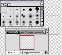 Shows the process of reorganizing the palette positions, by dragging the "navigator" up to dock it along with the brushes. Notice the "gray outline" that follows the navigator palette into its new position. When the body of the brushes palette assumes a bold outline, it is "in position" and you can release the mouse button. |
