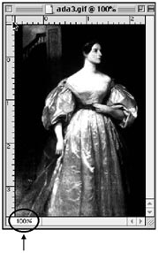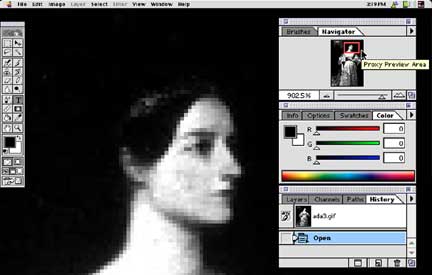 Magnification and Navigation The Magnifying Glass, located at the bottom of the tool palette, allows you to click on the image to make it larger. Hold down the option key to change the "plus" inside the magnifying glass to a "minus" and click to reduce the size of the image. Click and drag with the magnifying glass to fill the screen with the "selected" area. Command "+" and Command "-" are shortcuts for increasing and decreasing image size. The hand tool is one way to move the image around within a window. Click on the tool to choose it, move the cursor to the image area, then click and drag. A new computer user can quickly pick up speed and facility by learning to perform certain types of operations without using only key commands. Learn to use both your hands and reduce the number of mouse clicks by switching tools without using the mouse to choose them in the toolbox. Instead, trying switching using key commands. If you see a piano player sit down to play a tune with one hand, that's a pretty good sign that they are a beginner and haven't had piano lessons. Learning to coordinate both hands is key to piano playing, typing and using a computer. It is important to be able to coordinate your hands on the keyboard and the mouse, as well. My favorite way of getting around an image, when the image is bigger than the window, is to use the hand tool. I am usually already working with a different tool, like the rubber stamp or pen tool, when I notice I've run out of real estate. That's where a temporary, quick switch to the keyboard shortcut for the hand tool is helpful. Listed below are some of the ways to get around the image: