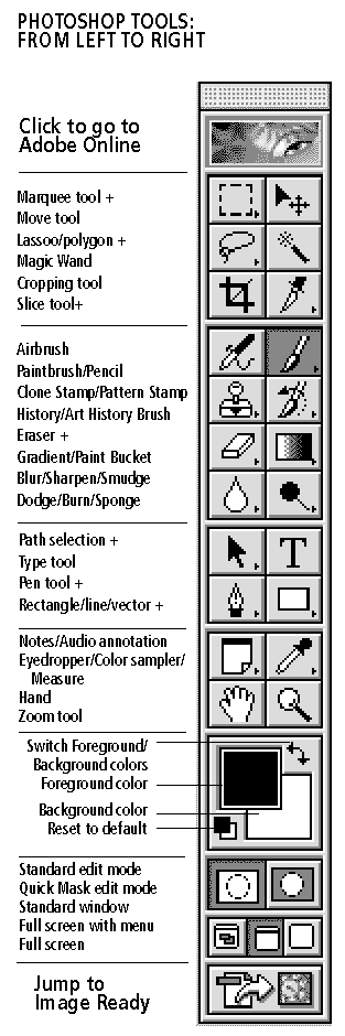 One terrific thing about Photoshop (and any well-written computer software) is that it establishes a pattern of behavior, and then repeats the pattern so that the user can "intuitively" anticipate how the software will respond. For example, clicking on the paintbrush, displays the palette that contains a variety of "options" resulting in unique behaviors for the paintbrush. The options palette, which is located just under the menu bar, allows the user customize the tool's behavior. Once we've learned how to call up the options for the paintbrush, we can assume that clicking on the pencil, for example, should bring up the options palette for the pencil, allowing you to customize its behavior. The tool palette is divided into discrete sections, grouping tools that have related functions. If a tool displays a small "arrow" in the lower right corner of the tool, clicking and holding down on the tool will pop up an additional tool or tools with similar or related functions. Grouping tools in this manner significantly reduces the size of the tool palette, keeping its appearance neat. We'll be examining the uses and behaviors of Photoshop's tools and features more closely as we use them in projects and exercises. GET TOOLS overview. This pdf file summarize calls out each of the tools and summarizes their behavior. |