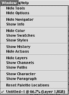 Like all software applications, Photoshop has its own, unique set of menu commands. Adobe has done a great job with the logical arrangement of the menus. The Window Menu, contains all of the palettes and open documents. Pull down to any of the palettes, release and that palette is opened. Open as many Photoshop documents as RAM will allow, and switch between documents using the Window Menu.